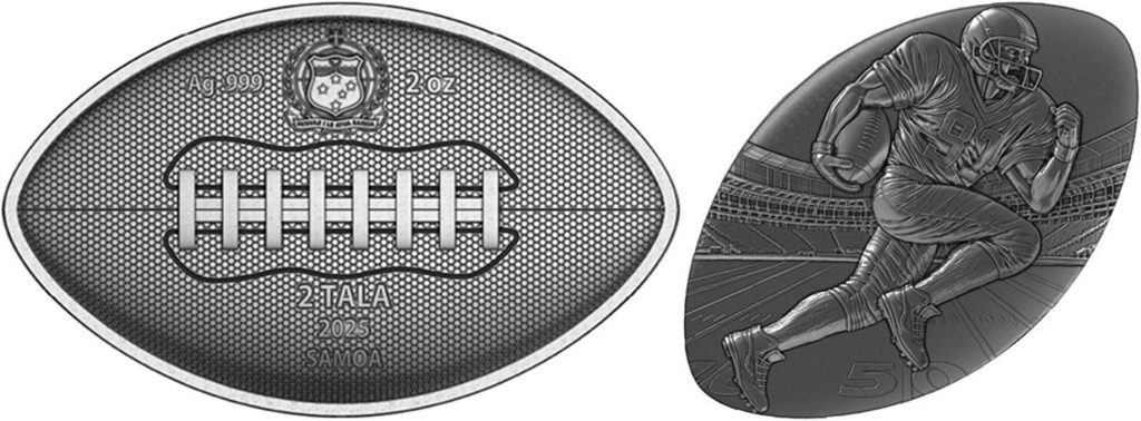 SAMOA 2 Tala 2025 – American Football – 2 oz 0.999 silver antique finish – mintage 1,500 – size and price unknown.
