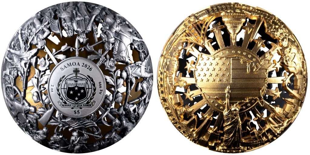 SAMOA 5 Dollars 2026 – Révolution et liberté – 62,2 g Argent 999 finition antique – 1776 exemplaires – diamètre 50 mm – prix observé 279 euros.
