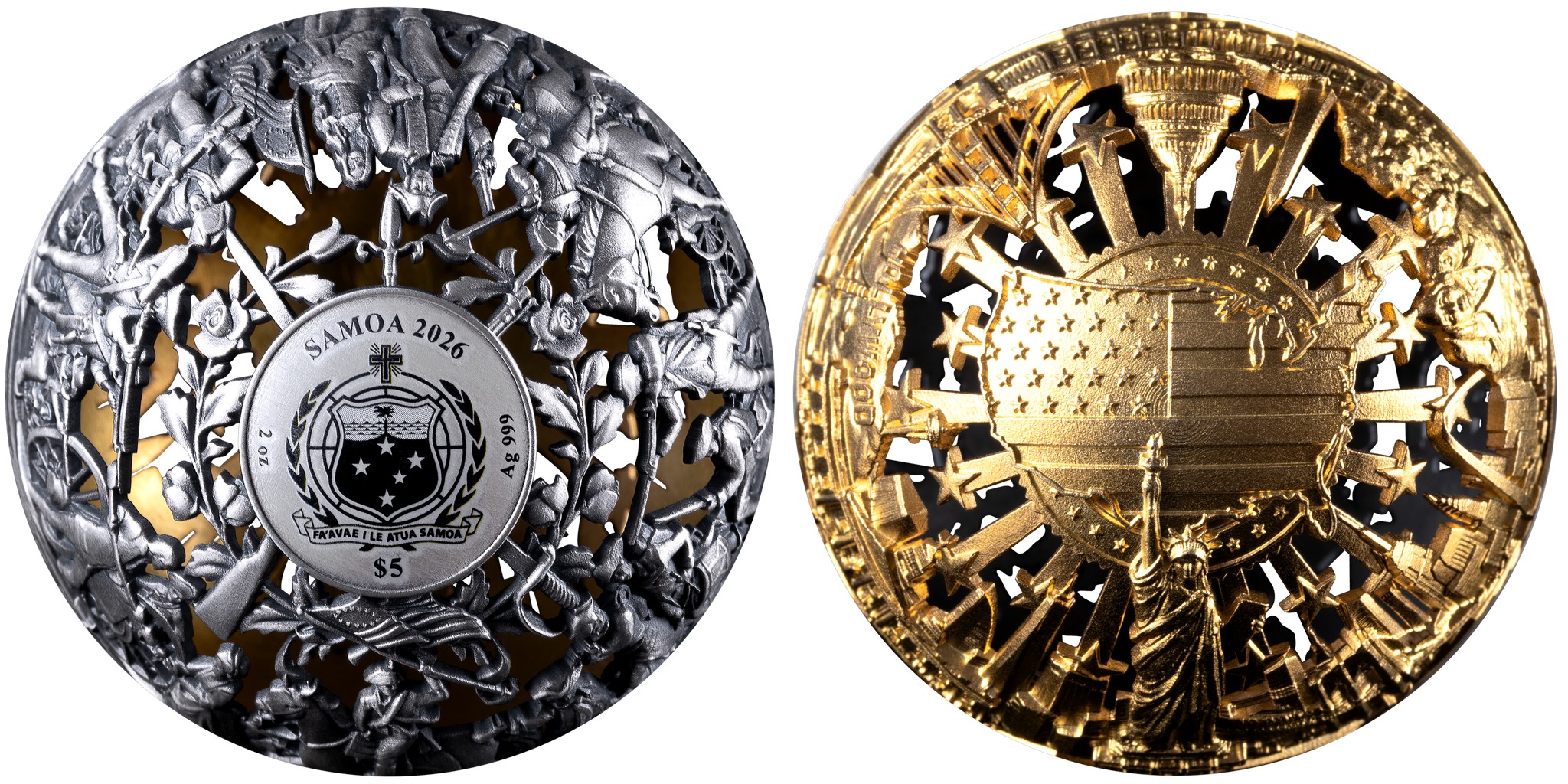 SAMOA 5 Dollars 2026 – Révolution et liberté – 62,2 g Argent 999 finition antique – 1776 exemplaires – diamètre 50 mm – prix observé 279 euros.