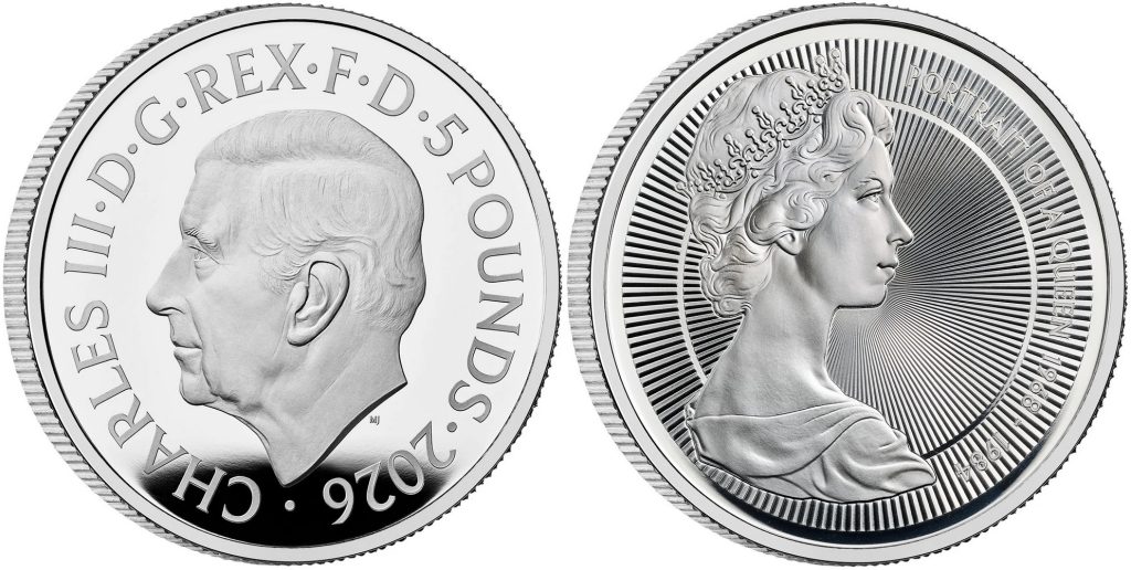 UNITED KINGDOM 5 Pounds 2026 – Portait of a Queen : The Second Effigy – 28.28 g 0.925 silver Proof – mintage 4,410 – diameter 38.61 mm – price $170.70. 56.56 g piedfort exist.