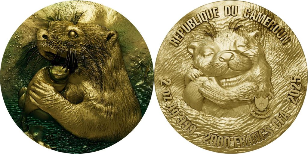 CAMEROUN 2000 Francs CFA 2025 – Animaux mignons : Loutre – 62,2 g Argent 999 finition antique (plaqué or) – 69 exemplaires seulement – diamètre 50 mm – prix observé 289,95 euros.