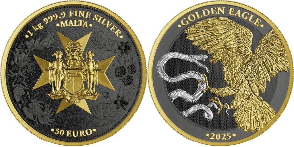 MALTA 30 Euro 2025 – Golden Eagle – 1 kg 0.999 silver BU (high relief with black ruthenium and gold plated) – mintage 100 pcs only – diameter 100 mm – unknown price.