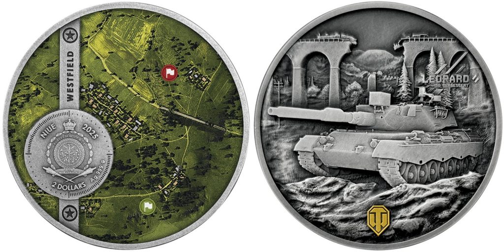 NIUE 2 Dollars 2025 – Tank Leopard 120 – 1 oz 0.999 silver antique finish – mintage 500 pcs only – diameter 38.61 mm – unknown price.