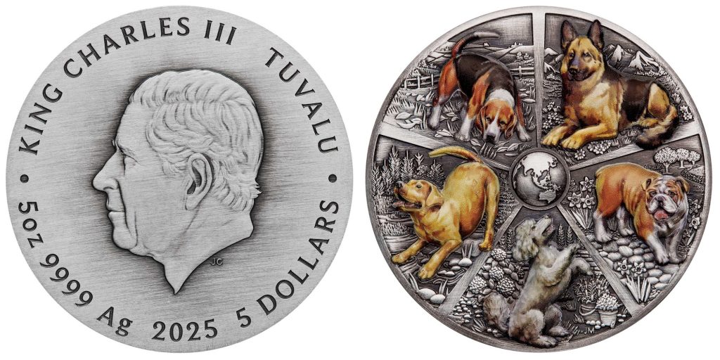 TUVALU 5 Dollars 2025 – World Popular Dogs – 5 oz 0.999 silver antique finish – mintage 388 pcs only – diameter 55.9 mm – price $653.80.