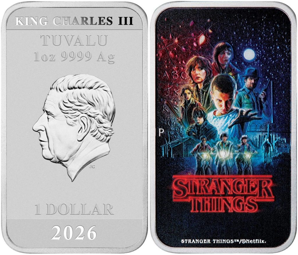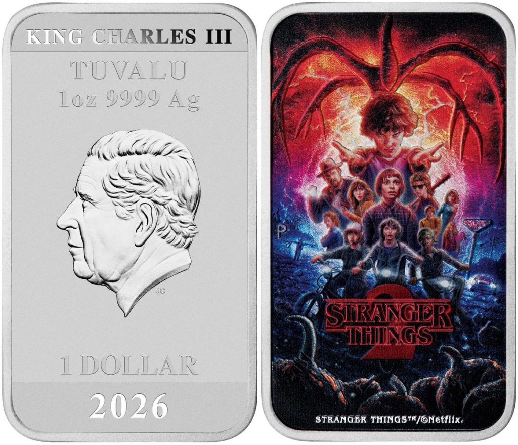 TUVALU 1 Dollar 2026 – Stranger Things – season 1 – 1 oz 0.999 silver BU – mintage 1,500 – size 27.6 x 47.6 mm – price $129.60.