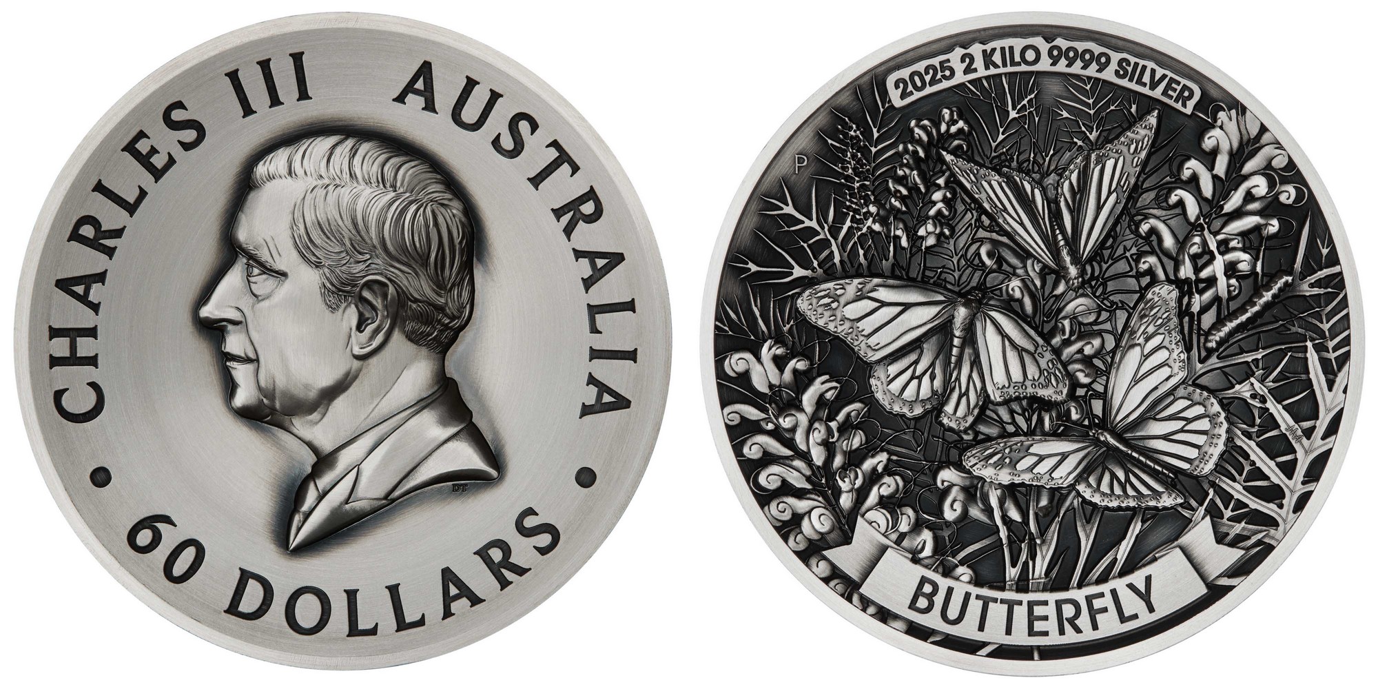 AUSTRALIA 60 Dollars 2025 – Butterfly – 2 kg 0.999 silver antique finish (high relief) – mintage 200 pcs only – diameter 101.30 mm – price $5,514.