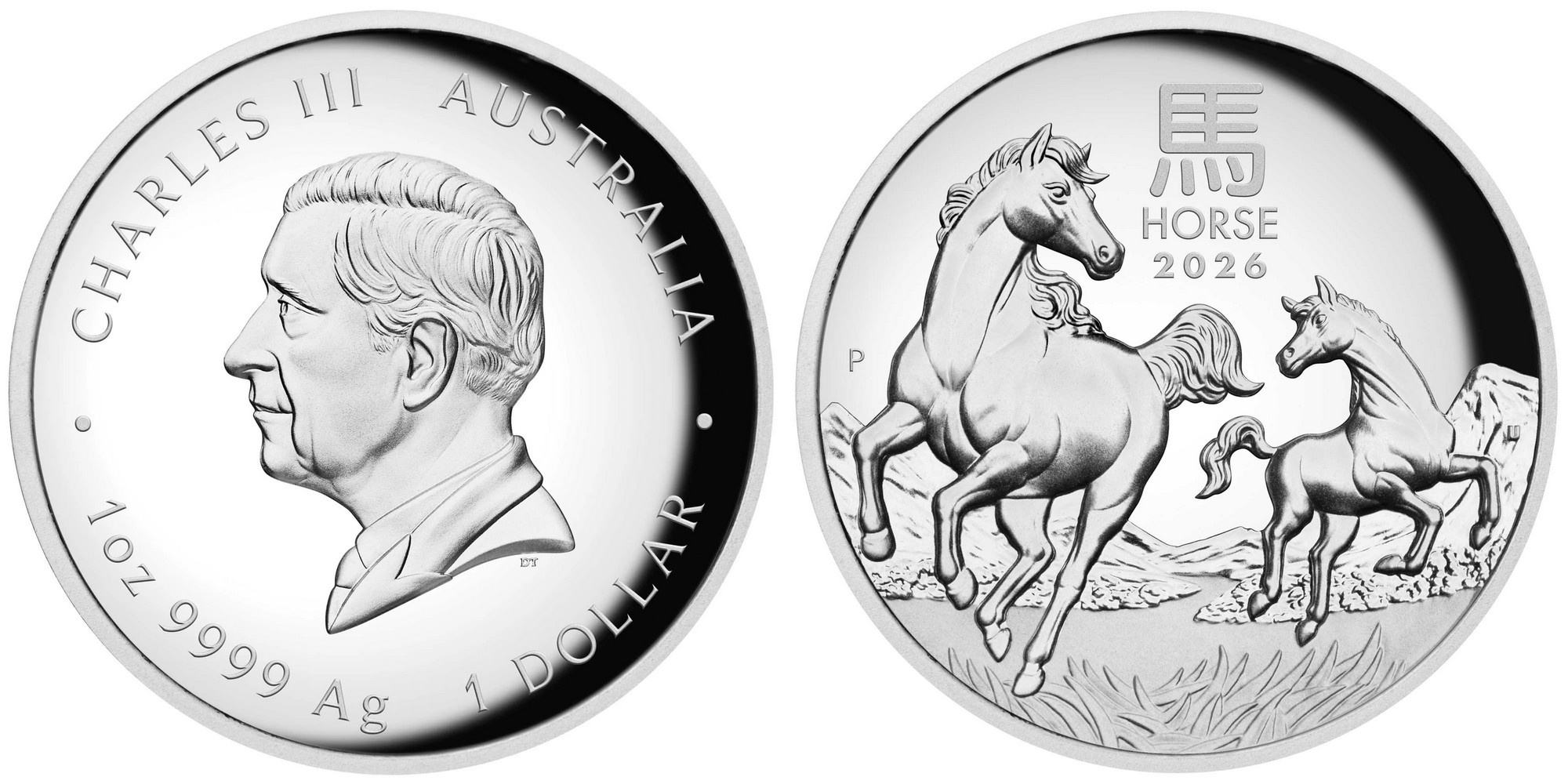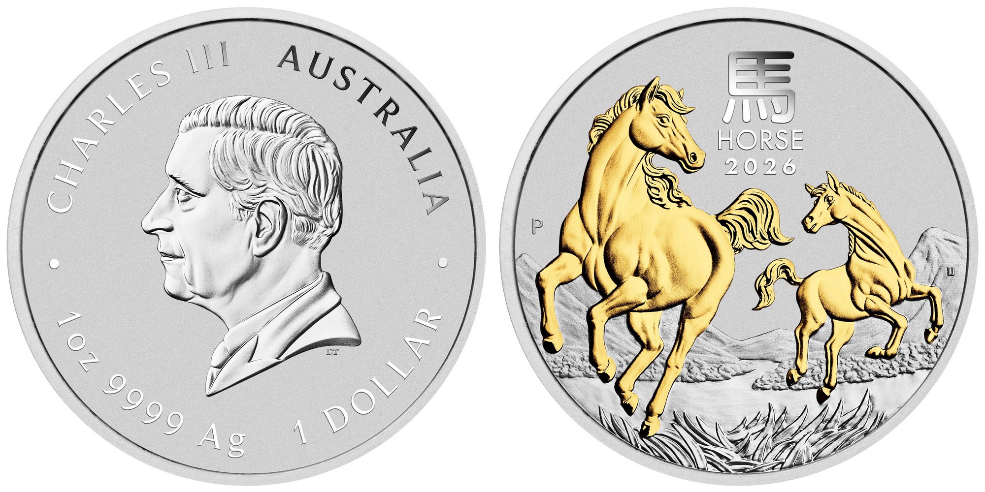 AUSTRALIA 1 Dollar 2026 – Year of the Horse – 1 oz 0.999 silver BU (selective gilding) – mintage 25,000 – diameter 40.9 mm – price $124.35.