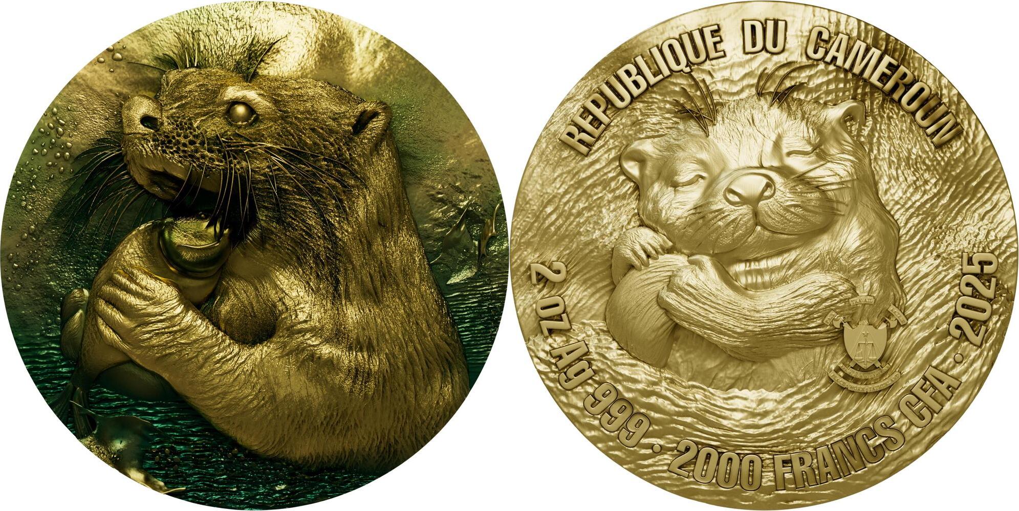 CAMEROON 2000 Francs CFA 2025 – Cute Animals : Otter – 2 oz 0.999 silver antique finish (gilded) – mintage 69 pcs only – diameter 50 mm – observed price $337.40.