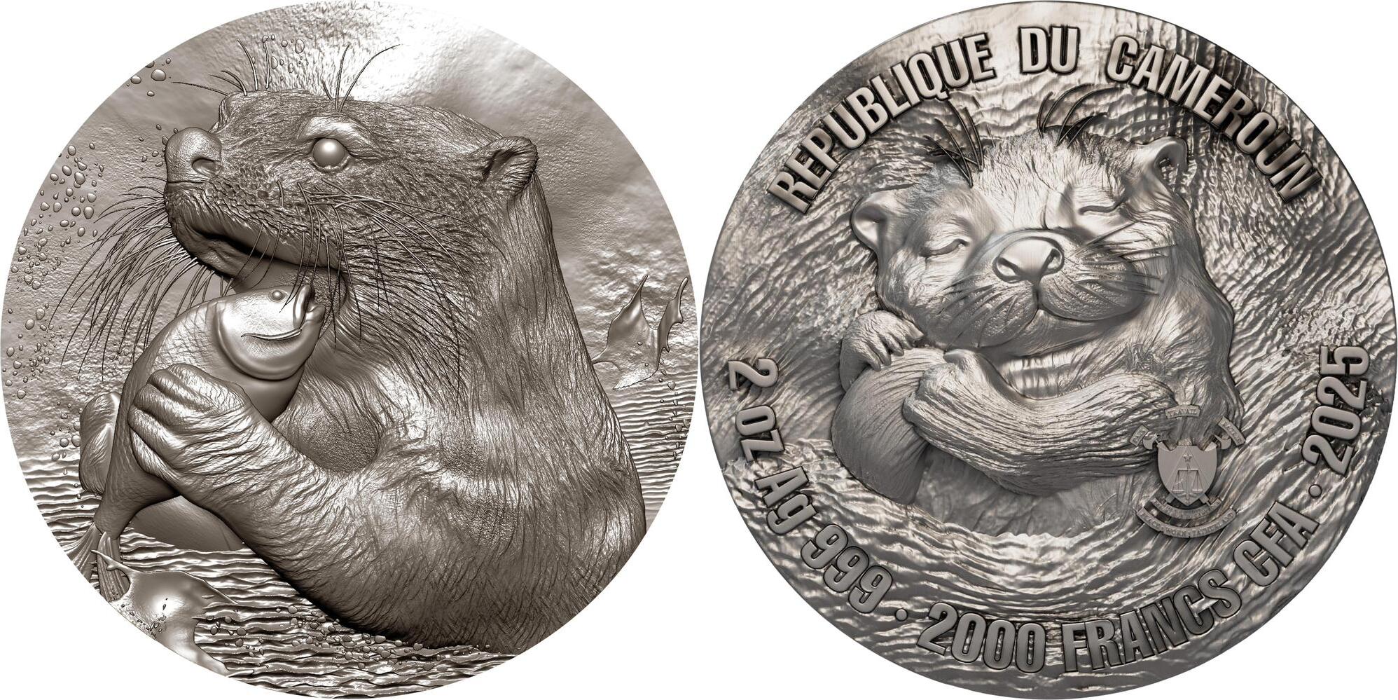 CAMEROON 2000 Francs CFA 2025 – Cute Animals : Otter – 2 oz 0.999 silver antique finish – mintage 129 pcs only – diameter 50 mm – observed price $337.40.