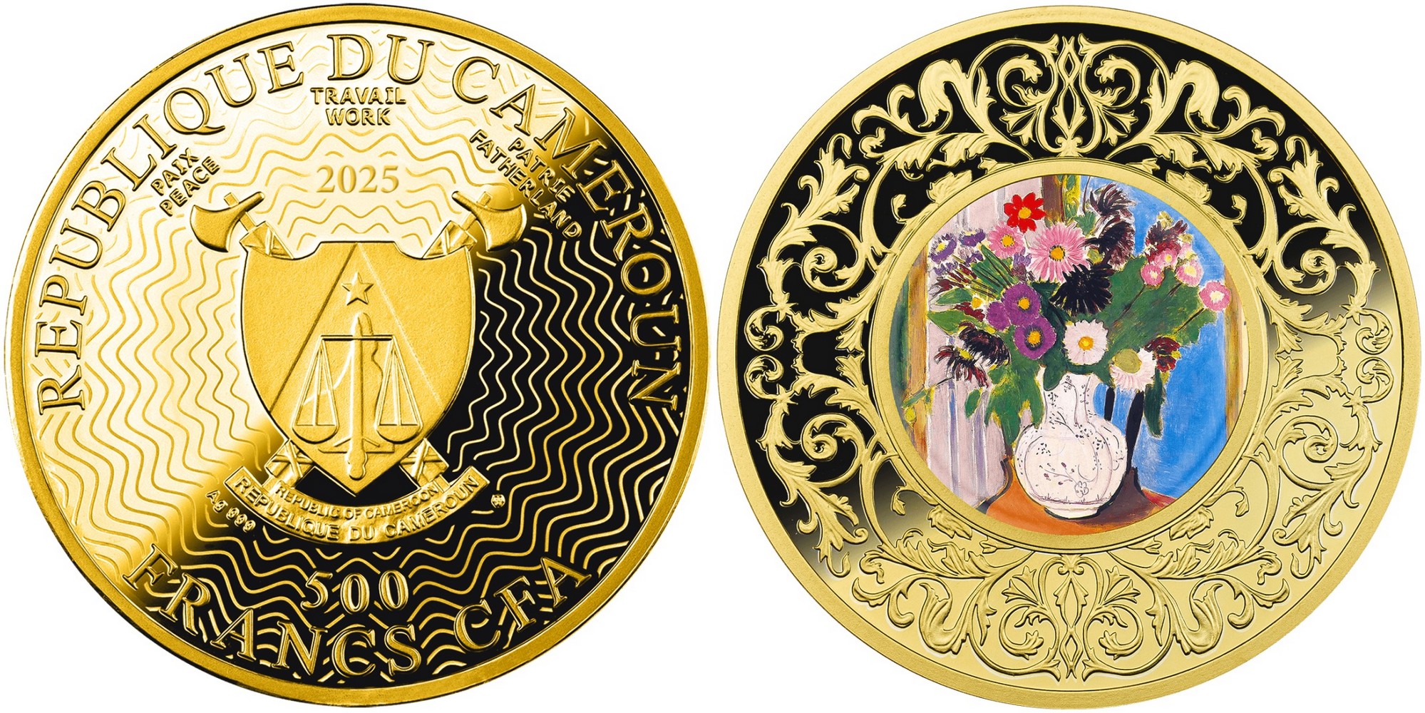 CAMEROUN 500 Francs CFA 2025 – Fleurs d’Henri Matisse – 17,5 g Argent 999 Proof (plaqué or) – 555 exemplaires – diamètre 50 mm – prix observé 89,95 euros.
