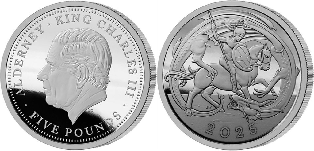 ALDERNEY 5 Pounds 2025 – St George & the Dragon – 1 oz 0.999 silver Proof – mintage 800 pcs – diameter 38.61 mm – unknown price. 5 ounces version exist.