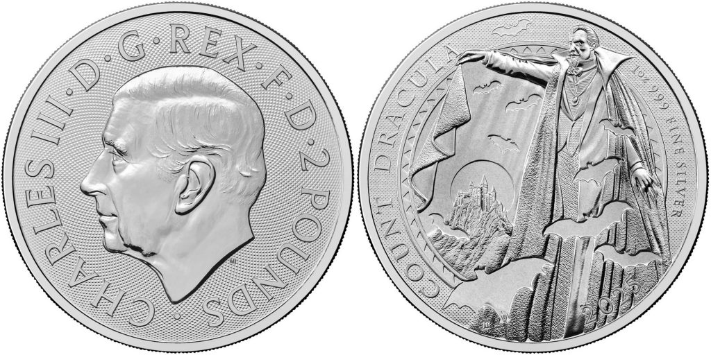 UNITED KINGDOM 2 Pounds 2025 – Count Dracula – 1 oz 0.999 silver Bullion – mintage 50,000 – diameter 38.61 mm – unknown price.