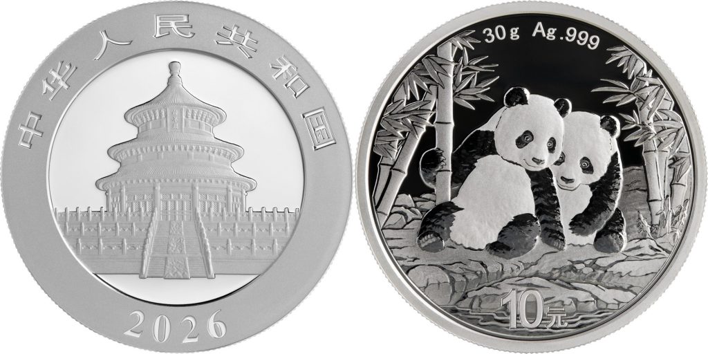 CHINA 10 Yuan 2026 – Panda – 30 g 0.999 silver BU – mintage 5 millions – diameter 40 mm – unknown price.