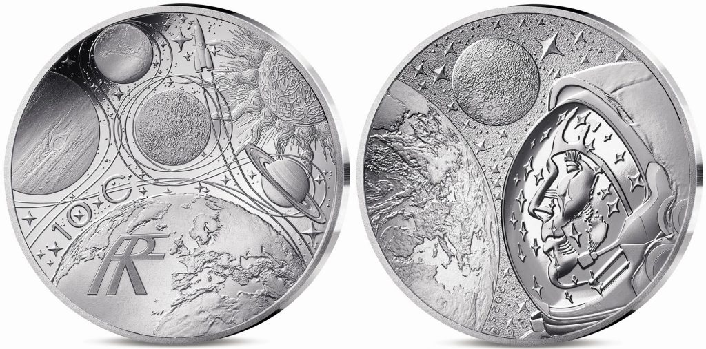 FRANCE 10 Euro 2025 – Odyssée spatiale avec Thomas Pesquet – 22,2 g Argent 999 Proof – 3000 exemplaires – diamètre 37 mm – prix 109 euros.