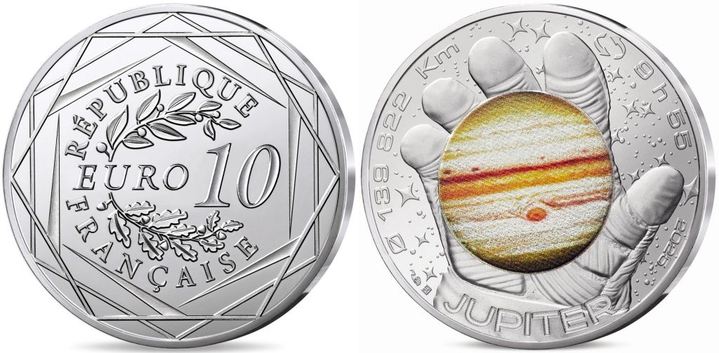 FRANCE 10 Euro 2025 – Odyssée spatiale avec Thomas Pesquet : Jupiter – 13 g Argent 333 UNC – 20 000 exemplaires – diamètre 31 mm – prix 15 euros.