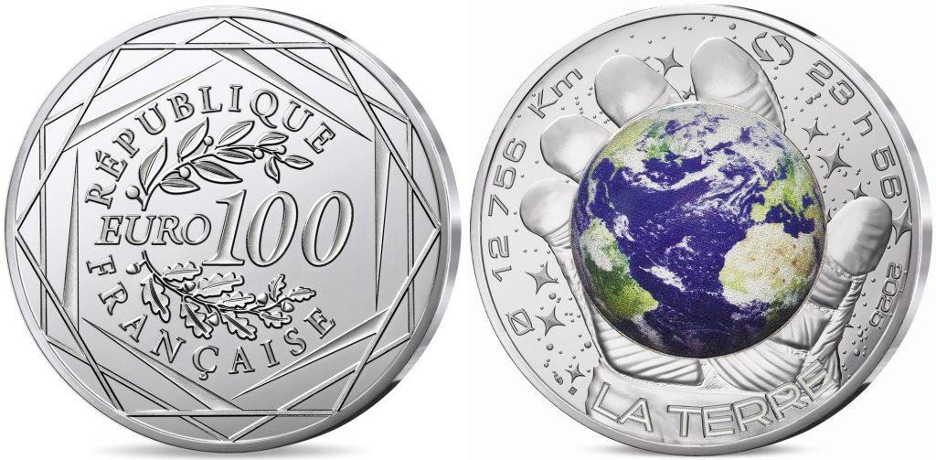 FRANCE 100 Euro 2025 – The Space Odyssey with Thomas Pesquet : Earth – 45 g 0.900 silver UNC – mintage 5,000 – diameter 47 mm – price $133.60.
