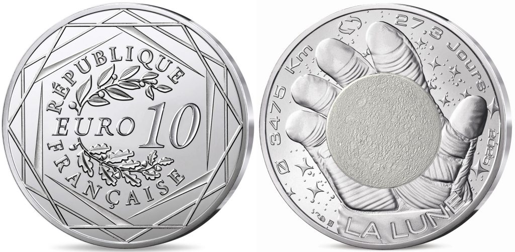 FRANCE 10 Euro 2025 – Odyssée spatiale avec Thomas Pesquet : La Lune – 13 g Argent 333 UNC (phosphorescente) – 20 000 exemplaires – diamètre 31 mm – prix 15 euros.