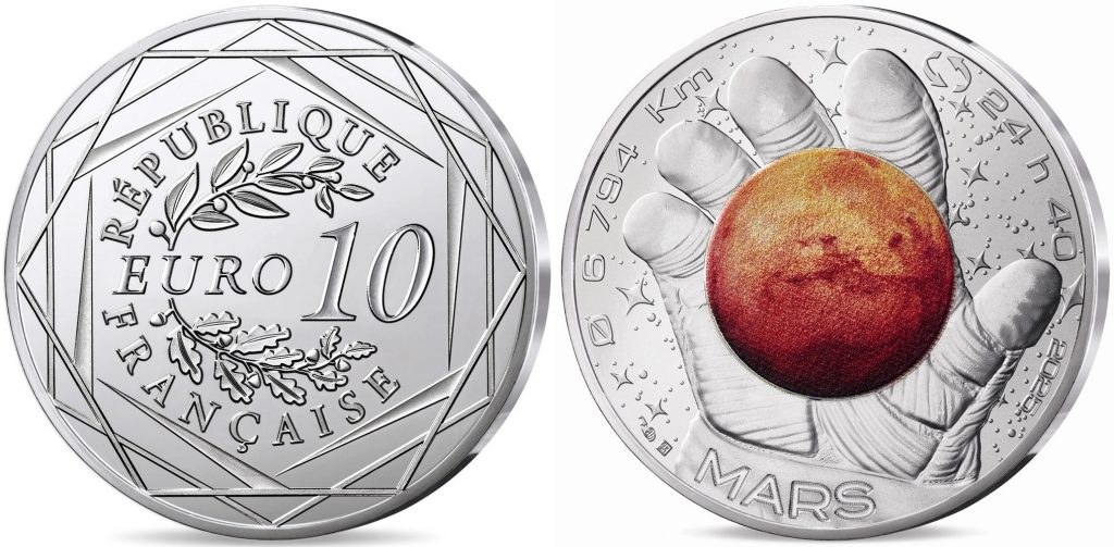 FRANCE 10 Euro 2025 – The Space Odyssey with Thomas Pesquet : Mars – 13 g 0.333 silver UNC – mintage 20,000 – diameter 31 mm – price $17.40.