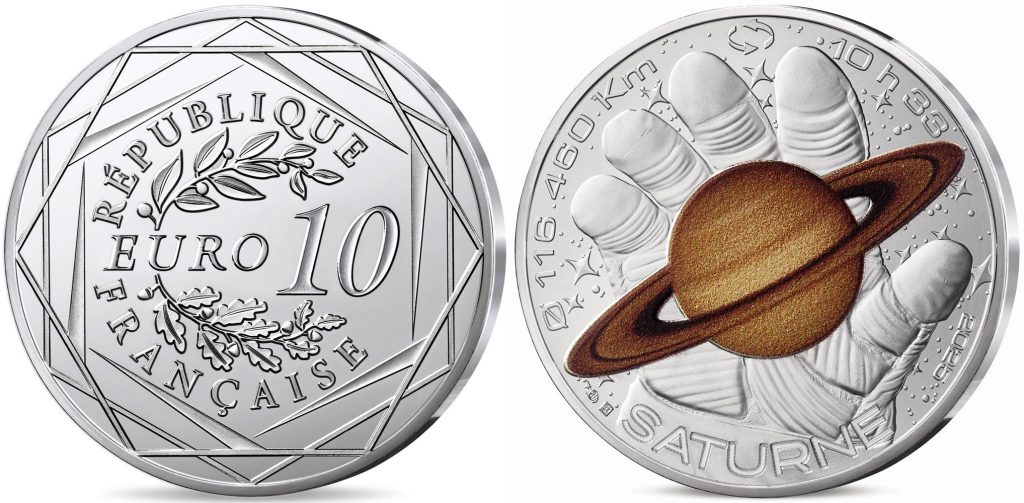 FRANCE 10 Euro 2025 – Odyssée spatiale avec Thomas Pesquet : Saturne – 13 g Argent 333 UNC – 20 000 exemplaires – diamètre 31 mm – prix 15 euros.