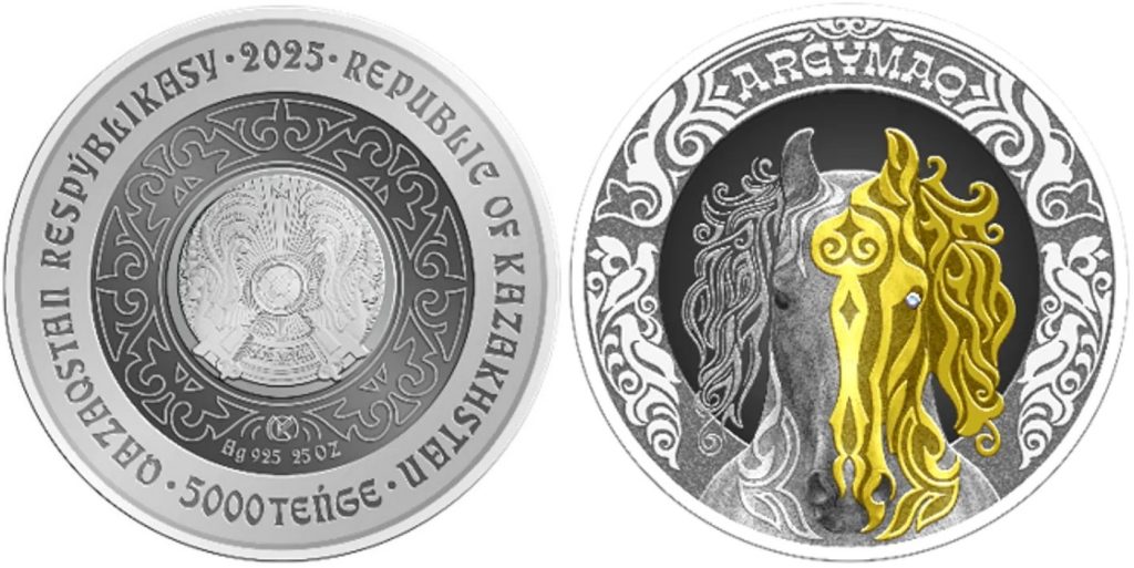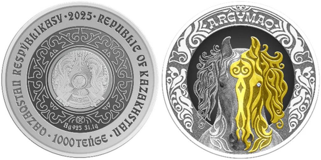 KAZAKHSTAN 1000 Tenge 2025 – Argymaq – 31.1 g 0.925 silver Proof (selective gilding with 1 mm diamond) – mintage 4,000 – diameter 38.61 mm – unknown price.