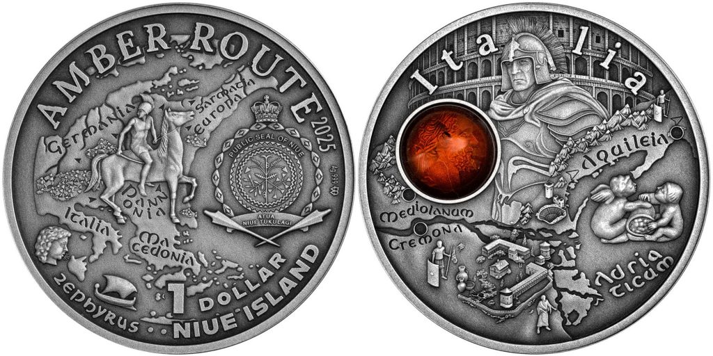 NIUE 1 Dollar 2025 – Amber Route : Italy – 17.5 g 0.999 silver antique finish (high relief with amber insert) – mintage 525 pcs – diameter 38.61 mm – unknown price.