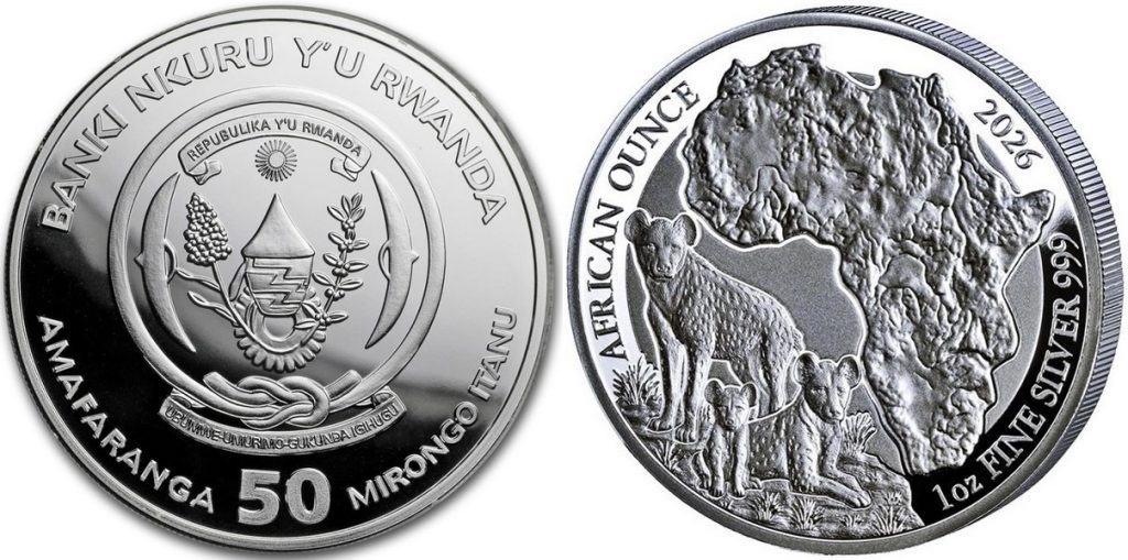 RWANDA 50 Francs 2026 – Hyenas – 1 oz 0.999 silver Proof – mintage 1,000 – diameter 40 mm – observed price $92.80.