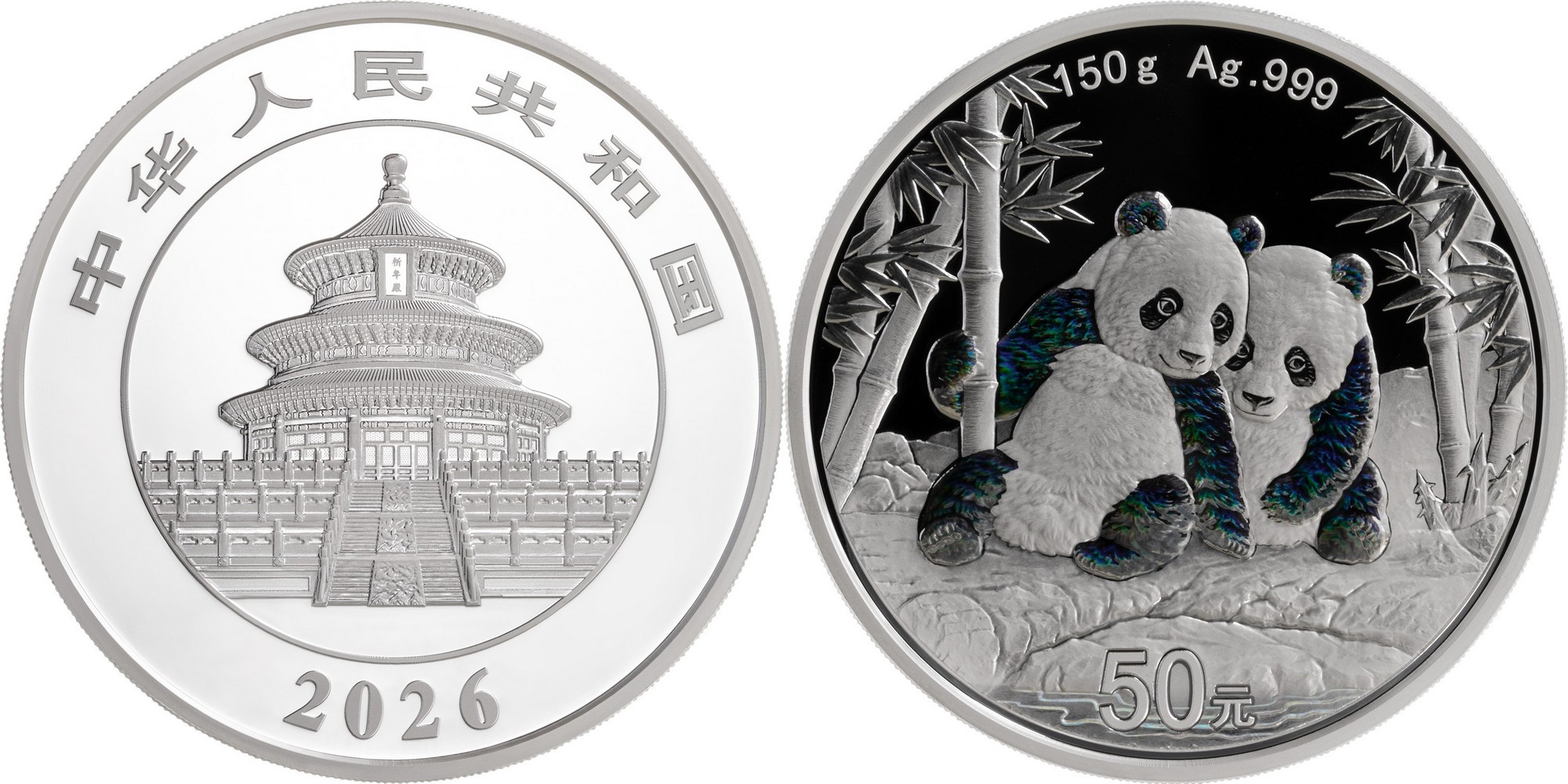 CHINA 50 Yuan 2026 – Panda – 150 g 0.999 silver Proof – mintage 30,000 – diameter 70 mm – unknown price.