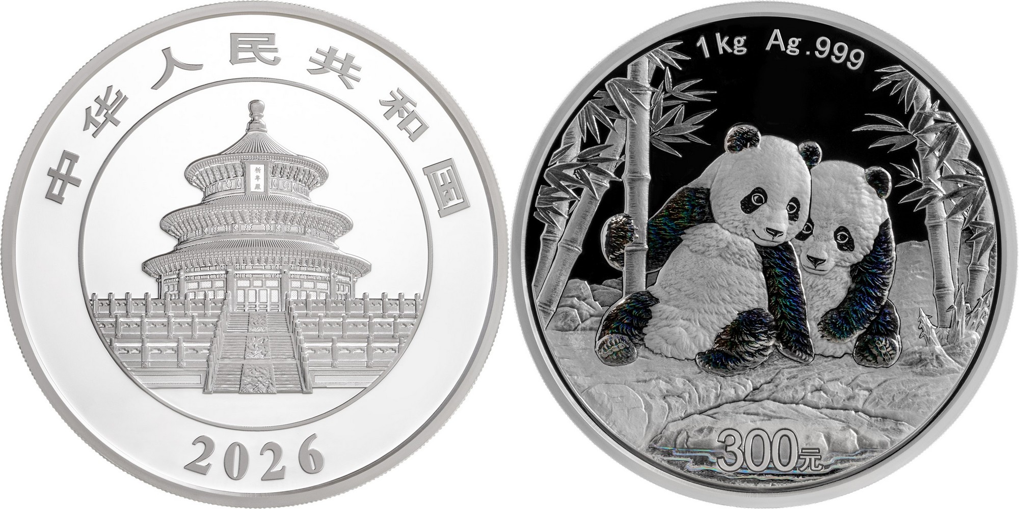 CHINA 300 Yuan 2026 – Panda – 1 kg 0.999 silver Proof – mintage 10,000 – diameter 100 mm – unknown price.