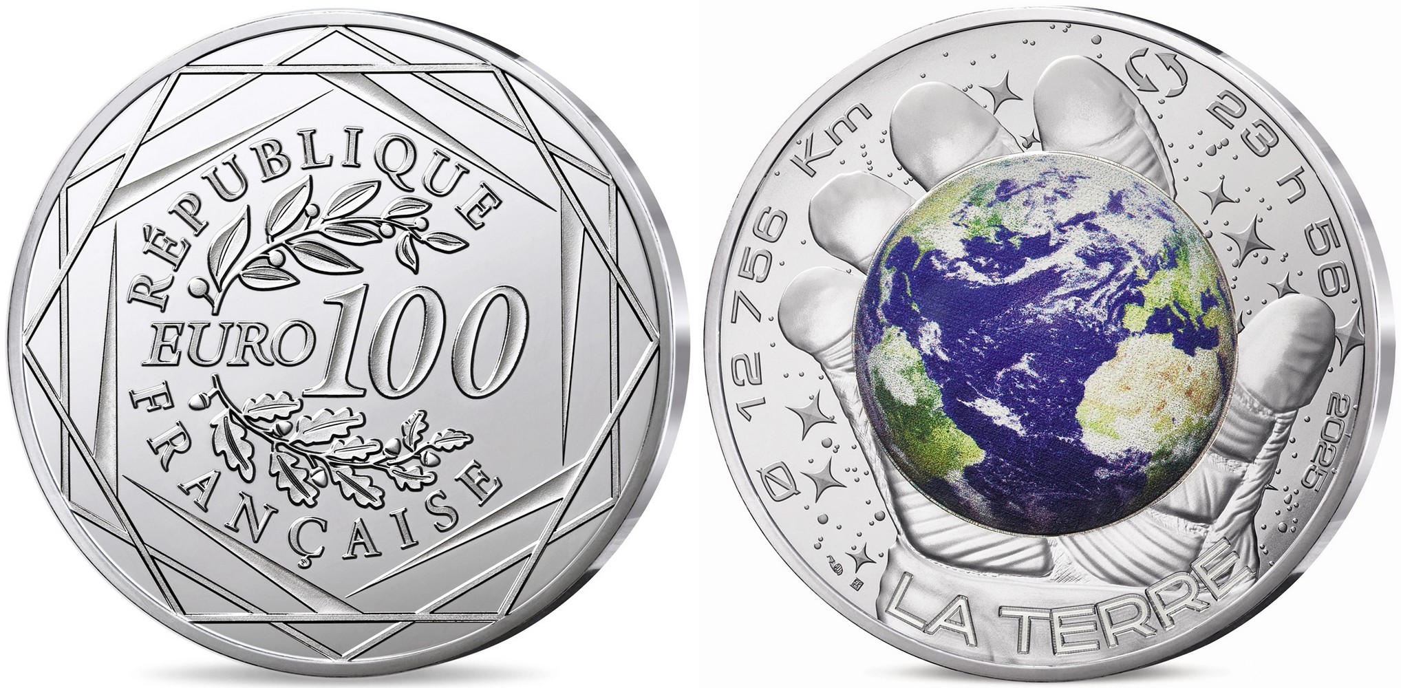 FRANCE 100 Euro 2025 – Odyssée spatiale avec Thomas Pesquet : La Terre – 45 g Argent 900 UNC – 5000 exemplaires – diamètre 47 mm – prix 115 euros.