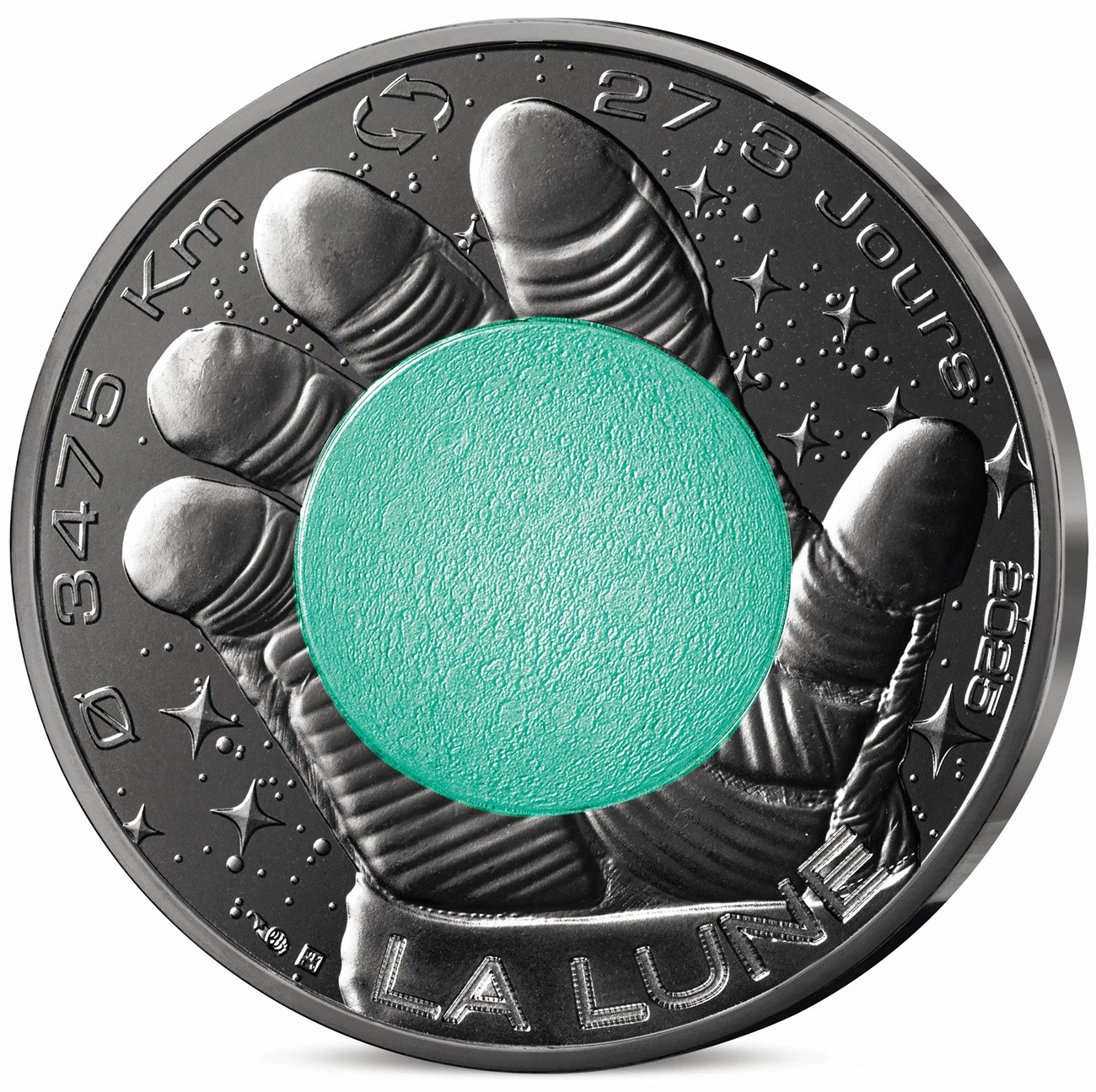 FRANCE 10 Euro 2025 – Odyssée spatiale avec Thomas Pesquet : La Lune – 13 g Argent 333 UNC (phosphorescente) – 20 000 exemplaires – diamètre 31 mm – prix 15 euros.