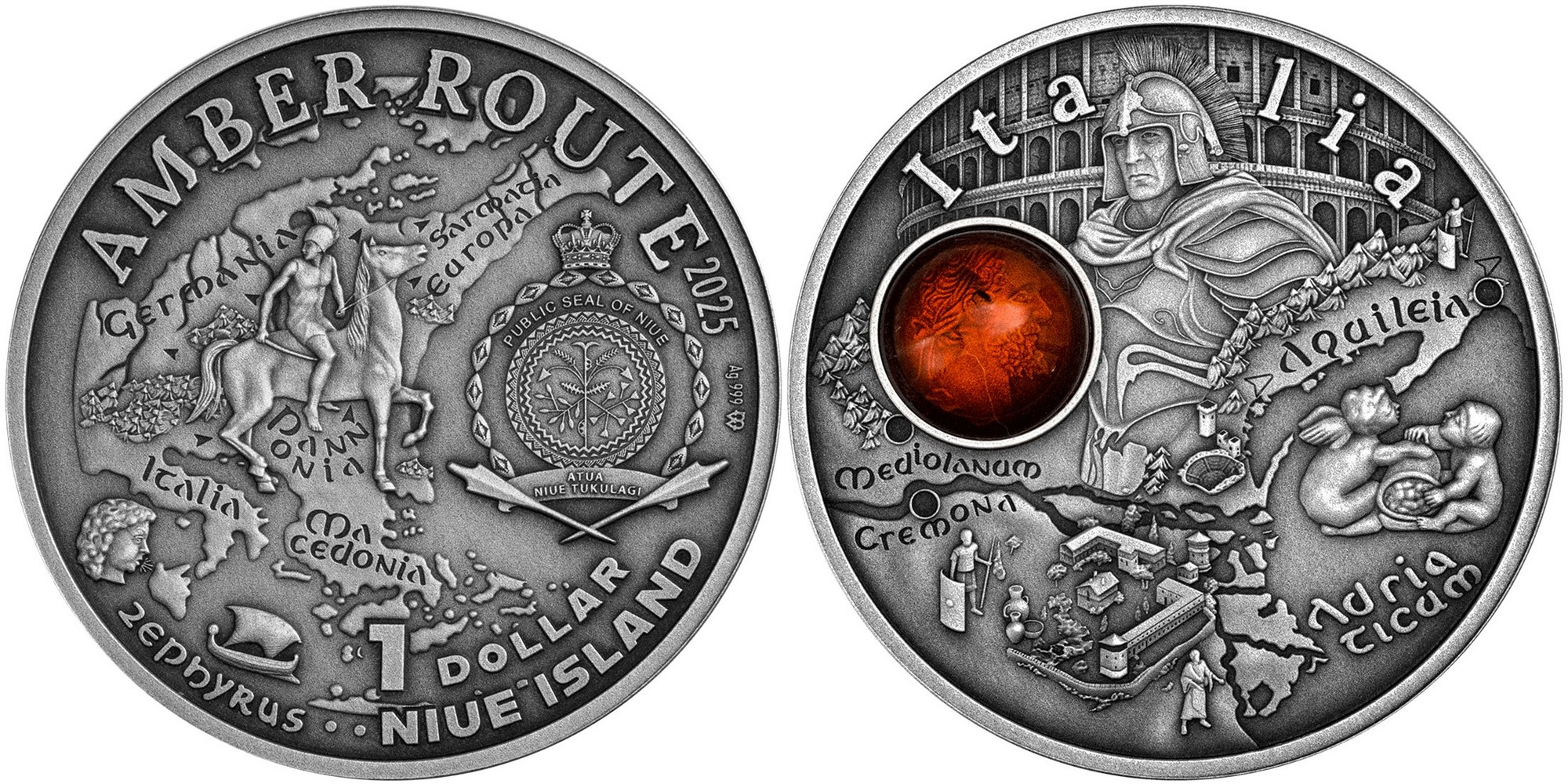 NIUE 1 Dollar 2025 – Amber Route : Italy – 17.5 g 0.999 silver antique finish (high relief with amber insert) – mintage 525 pcs – diameter 38.61 mm – unknown price.