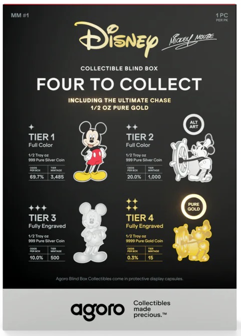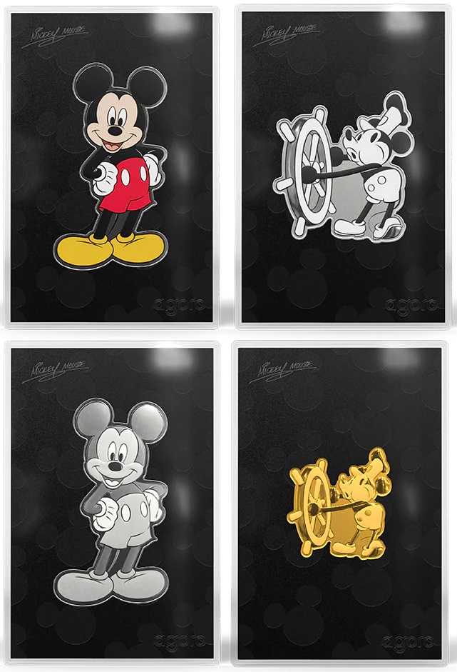 NIUE 1 or 100 Dollars 2025 – Disney Mickey Mouse Blind Box – ½ oz 0.999 silver Proof or ½ oz Gold 999 Proof – total mintage silver coins 4,985 , gold coin 15 pcs – size 67 x 37 mm or 36 x 38 mm – price $99. When ordering you will receive one of the 4 coins in the set at random.