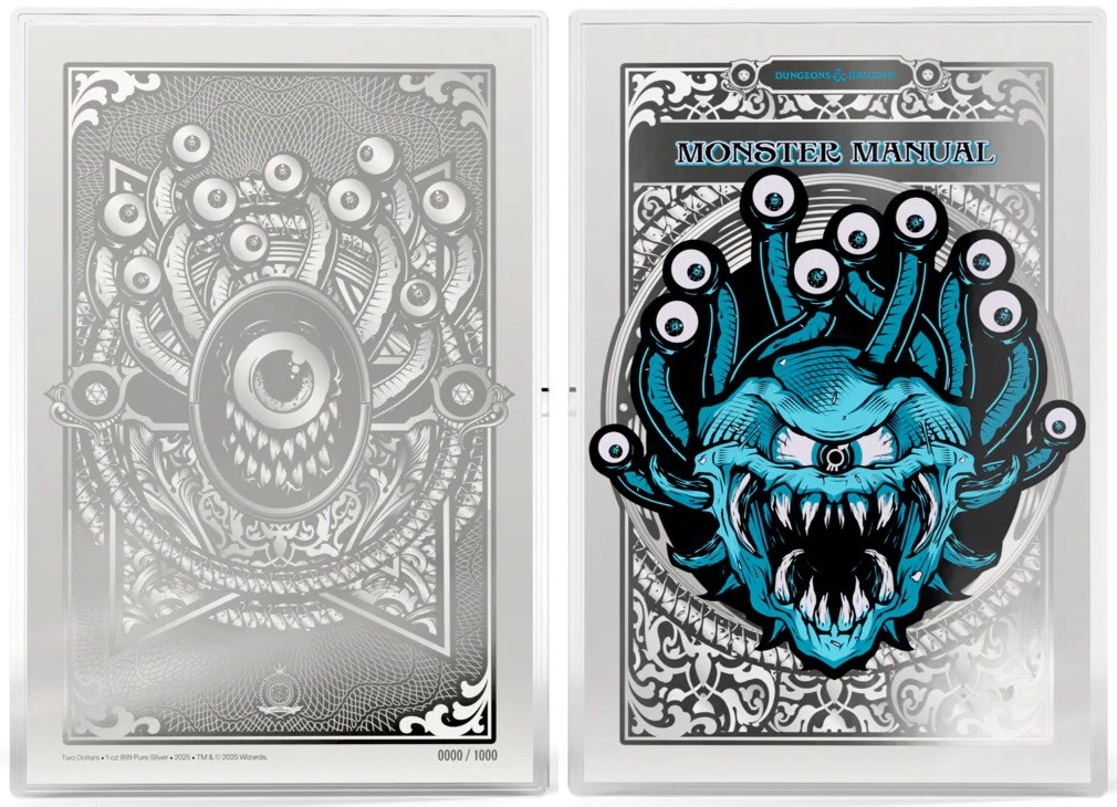 NIUE 2 Dollars 2025 – Dungeons & Dragons : Monster Manual – 1 oz 0.999 silver Proof – mintage 1,000 – size 175 x 262 mm – price $167.
