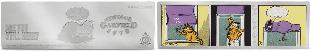 NIUE 2 Dollars 2025 – Garfield : Je déteste les lundis – 31,1 g Argent 999 Proof – 1000 exemplaires – taille 31 x 98 mm – prix 113,80 euros.