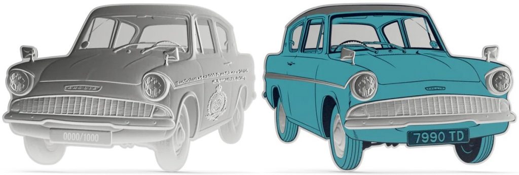 NIUE 2 Dollars 2025 – Harry Potter : Ford Anglia – 1 oz 0.999 silver Proof – mintage 1,000 – size 60 x 40 mm – price $132.