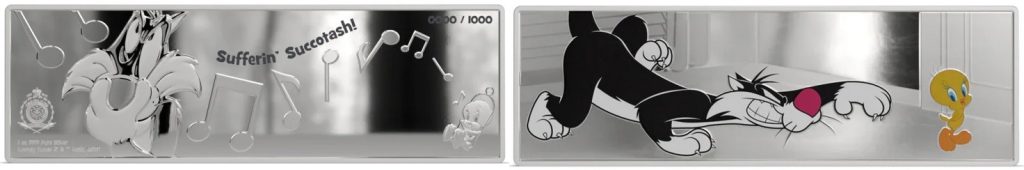 NIUE 2 Dollars 2025 – Looney Tunes : Sylvestre et Titi – 31,1 g Argent 999 Proof – 1000 exemplaires – taille 31 x 98 mm – prix 113,80 euros.