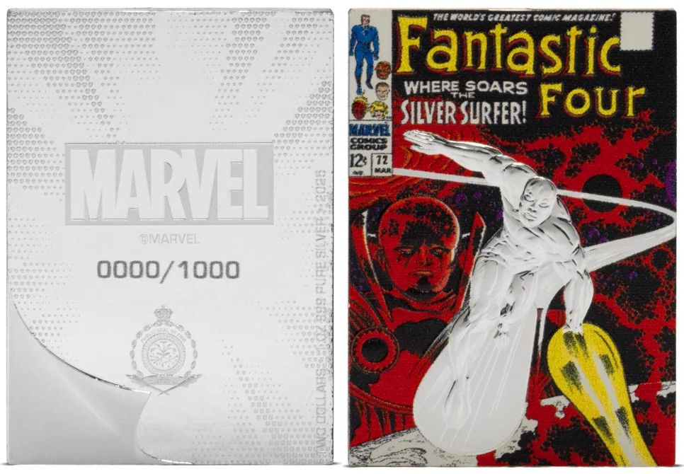 NIUE 2 Dollars 2025 – Marvel : Les 4 fantastiques n°72 – 31,1 g Argent 999 Proof – 1000 exemplaires – taille 31,5 x 45 mm – prix 113,80 euros.