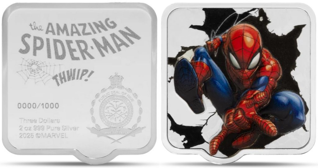 NIUE 3 Dollars 2025 – Spider-Man : Thwip – 2 oz 0.999 silver Proof – mintage 1,000 – size 43 x 45.7 mm – price $235.