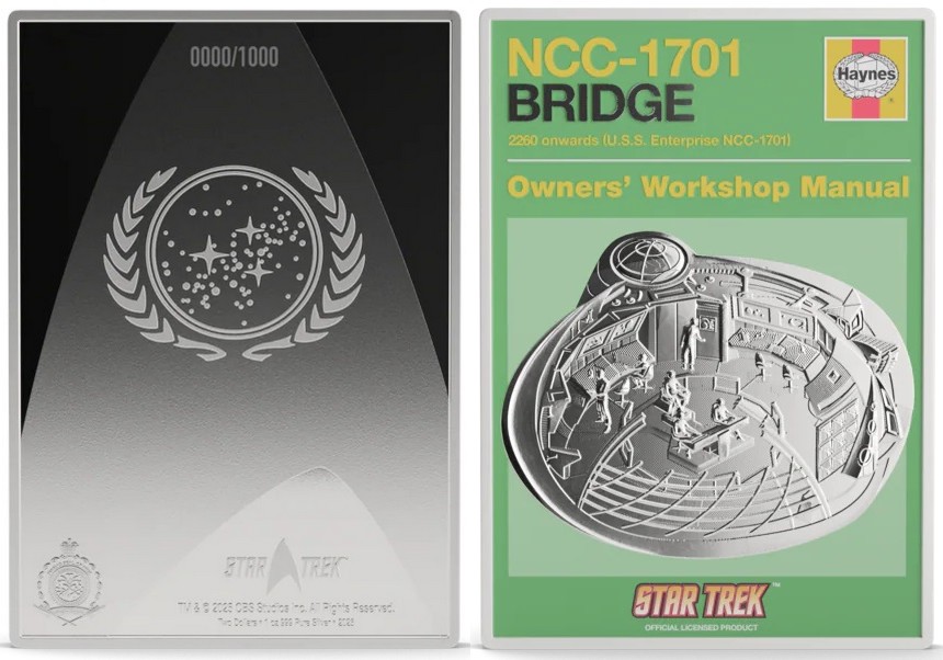 NIUE 2 Dollars 2025 – Star Trek : USS Enterprise Bridge Owner Manual – 1 oz 0.999 silver Proof – mintage 1,000 – size 46 x 65 mm – price $132.