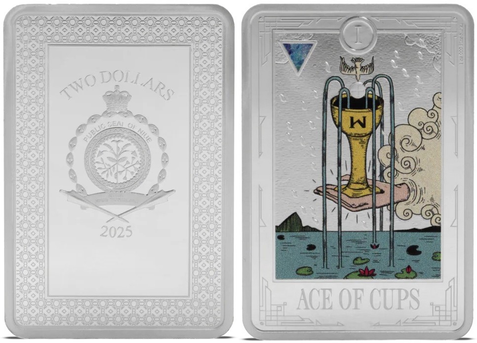NIUE 2 Dollars 2025 – Tarot : As de coupes – 31,1 g Argent 999 Proof – 1000 exemplaires – taille 53 x 36 mm – prix 96,35 euros.