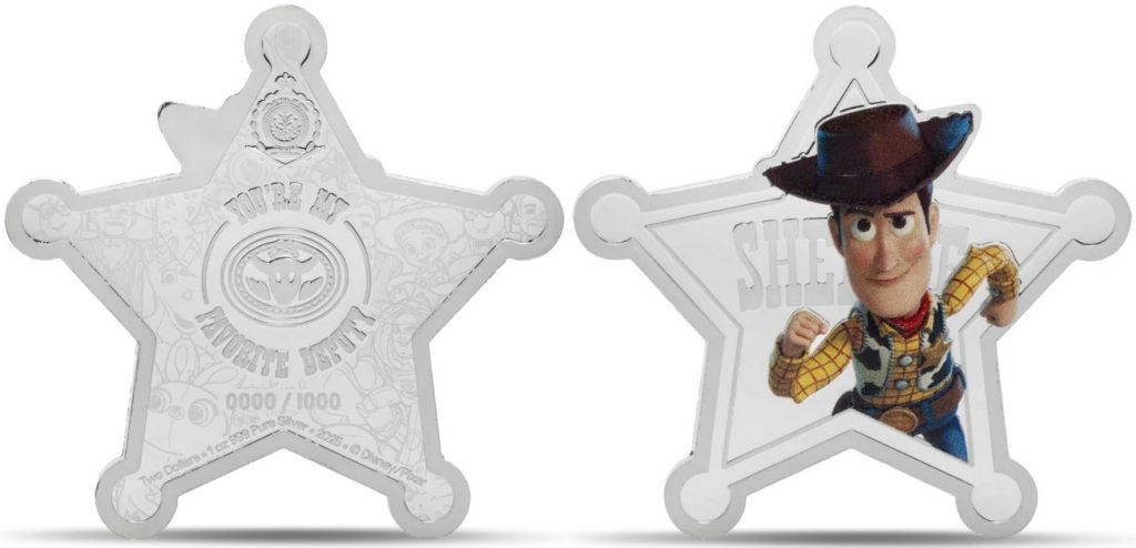 NIUE 2 Dollars 2025 – Toy Story : Woody – 1 oz 0.999 silver Proof – mintage 1,000 – size 50 x 47.9 mm – price $132.