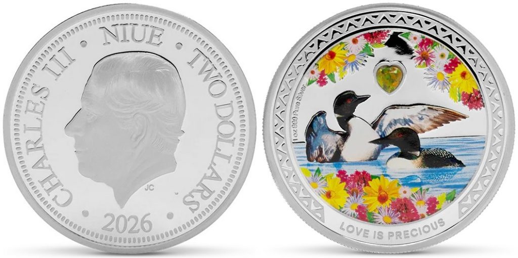 NIUE 2 Dollars 2026 – Love is Precious – 1 oz 0.999 silver Proof – mintage 2,000 – diameter 40 mm – price $107.