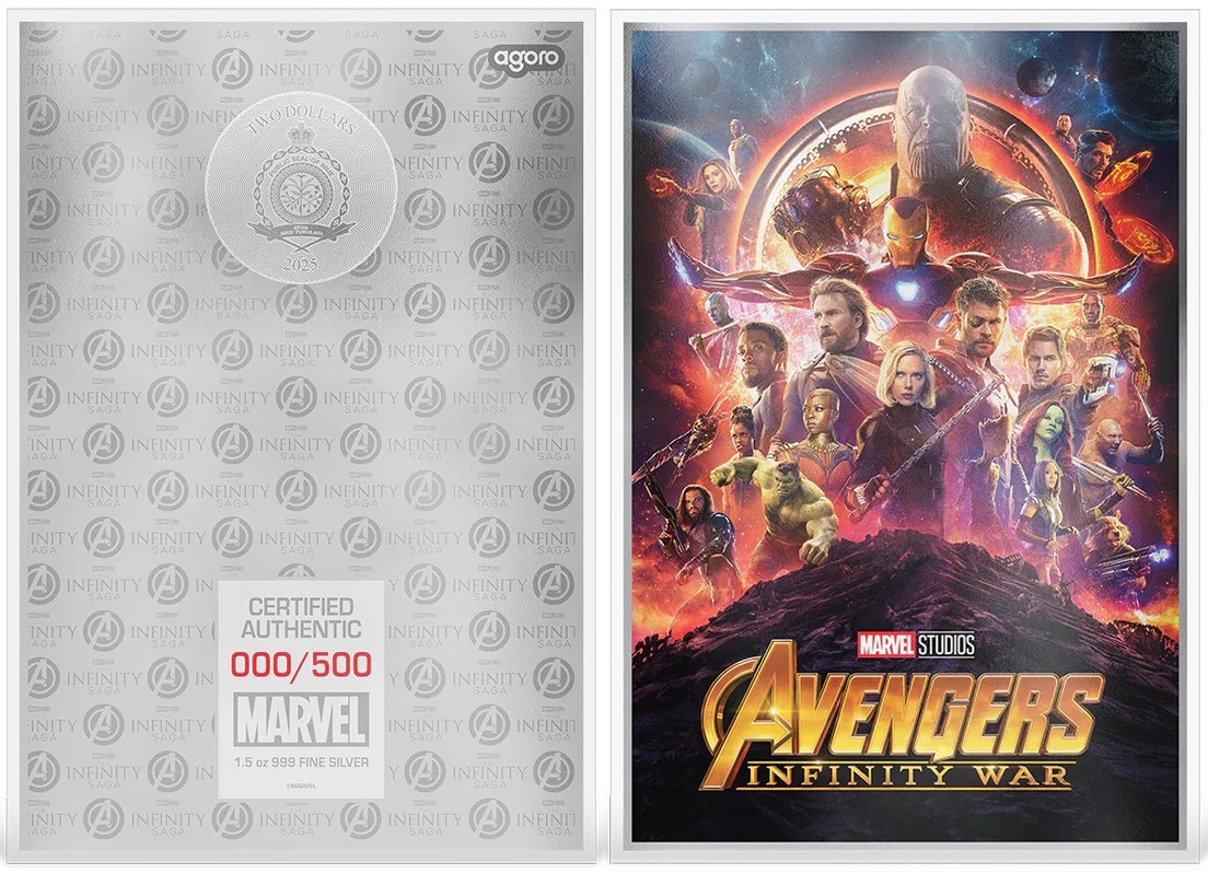 NIUE 2 Dollars 2025 – Avengers : Infinity War Phase III – 1.5 oz 0.999 silver Proof – mintage 500 pcs only – size 216 x 320 mm – price $199.