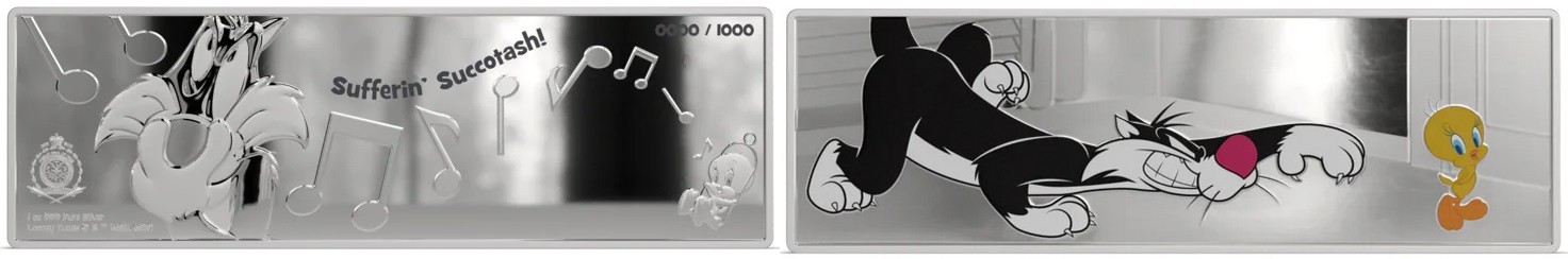 NIUE 2 Dollars 2025 – Looney Tunes : Sylvestre et Titi – 31,1 g Argent 999 Proof – 1000 exemplaires – taille 31 x 98 mm – prix 113,80 euros.