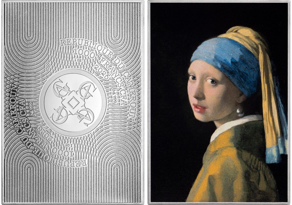 CAMEROUN 1000 Francs CFA 2026 – Galerie d’art : Jeune fille à la perle de Vermeer – 31,1 g Argent 999 Proof – 1000 exemplaires – taille 51,8 x 74 mm – prix ignoré.