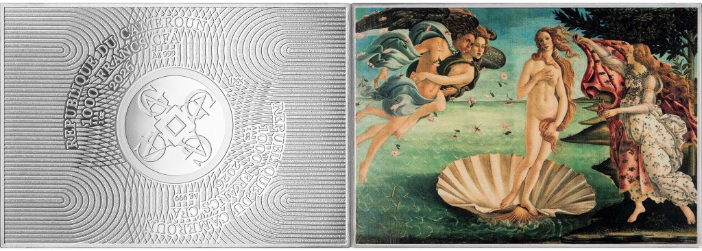 CAMEROON 1000 Francs CFA 2026 – Art Gallery : Birth of Venus by Botticelli – 1 oz 0.999 silver Proof – mintage 1,000 – size 74 x 51.8 mm – unknown price.