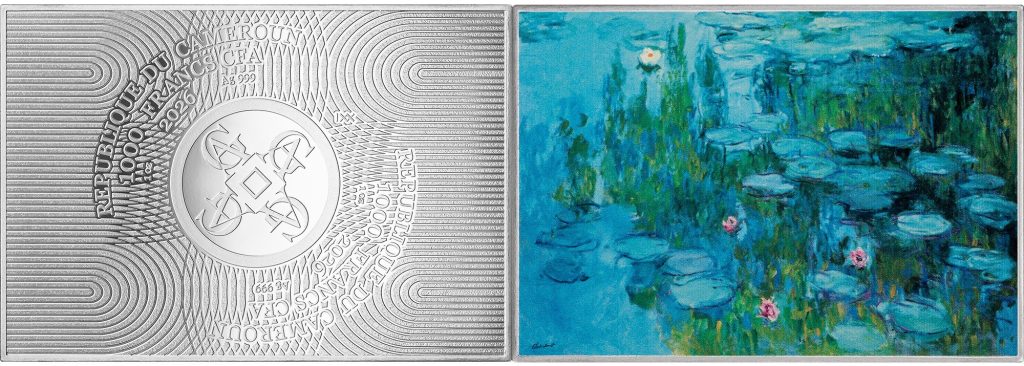 CAMEROUN 1000 Francs CFA 2026 – Galerie d’art : Nénuphars de Claude Monet – 31,1 g Argent 999 Proof – 1000 exemplaires – taille 74 x 51,8 mm – prix ignoré.