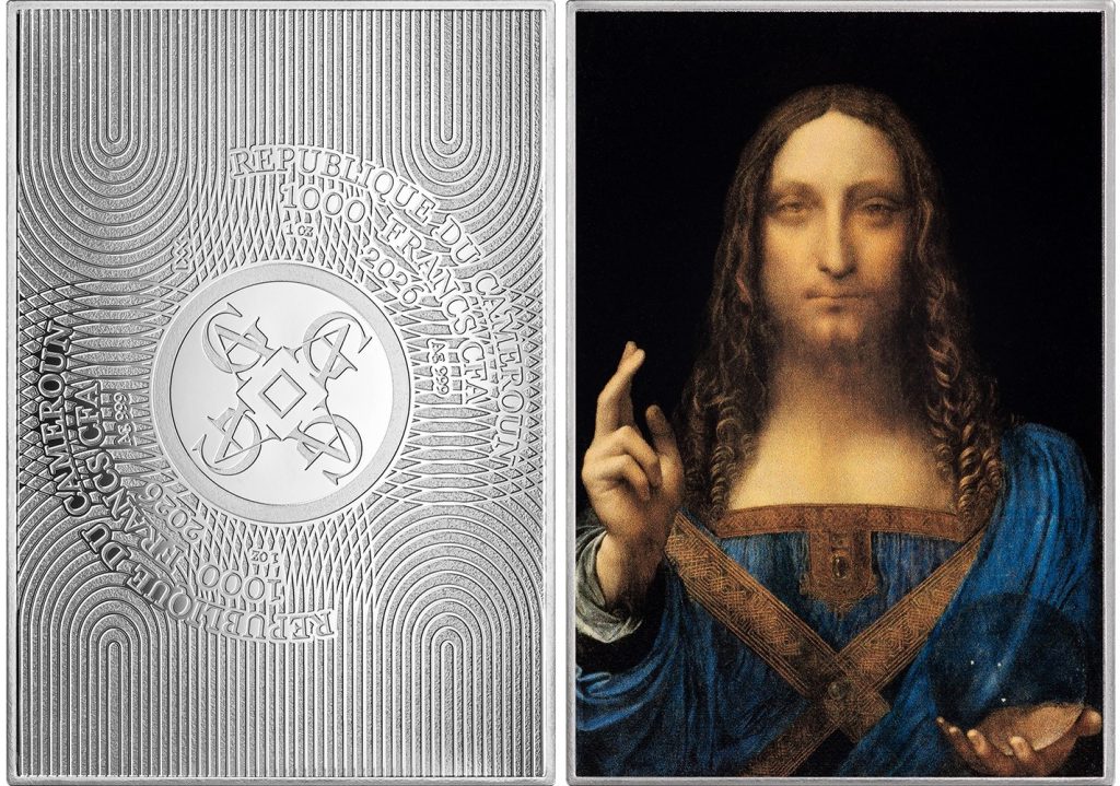 CAMEROON 1000 Francs CFA 2026 – Art Gallery : Salvator Mundi by Leonardo da Vinci – 1 oz 0.999 silver Proof – mintage 1,000 – size 51.8 x 74 mm – unknown price.