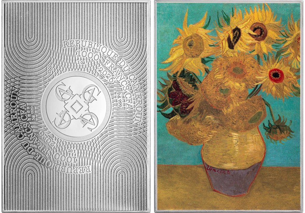 CAMEROON 1000 Francs CFA 2026 – Art Gallery : Sunflowers by Van Gogh – 1 oz 0.999 silver Proof – mintage 1,000 – size 51.8 x 74 mm – unknown price.