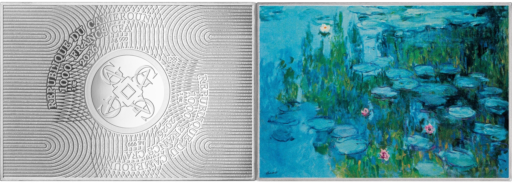 CAMEROON 1000 Francs CFA 2026 – Art Gallery : Waterlilies by Claude Monet – 1 oz 0.999 silver Proof – mintage 1,000 – size 74 x 51.8 mm – unknown price.